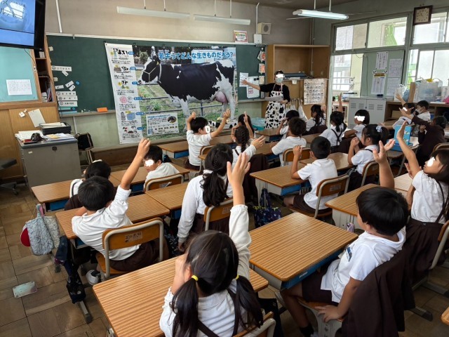 日本酪農さんのご協力で、牛乳について学習しました。実物大の牛の絵にびっくりしながら話を聞きました。また、バター作りも体験しました。とてもおいしかったそうです。