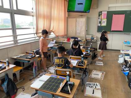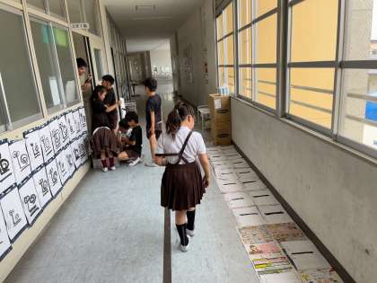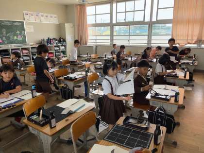 標準服が汚れないよう各自Tシャツに着替えて書いています。